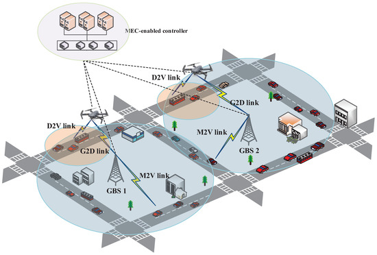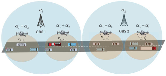 Let be the set of vehicles located within the effective coverage of the DSC at . If vehicle establishes a connection with the DSC at , the indication variable is set to 1; otherwise, 0. If a DSC at connects to GBS m, is set to 1; otherwise, set to 0. Once a DSC flies to GBSs’ coverage area, it automatically connects to the GBS with the highest spectral efficiency.