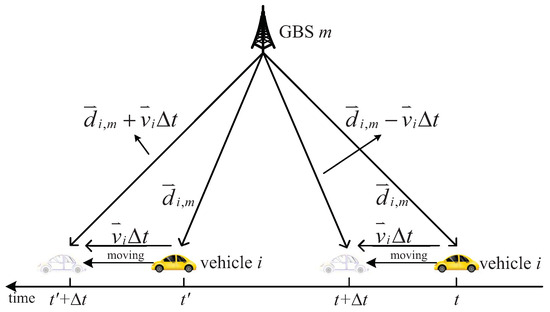 As shown in Figure 3, a complex vector space is used to characterize the effect of vehicle direction and speed on distance calculation, where is the distance vector from vehicle i to GBS m, and represents the velocity vector of vehicle i. During a period of length , the distance vector of vehicle i is expressed as . By the addition or subtraction of complex vectors, the Euclidean distance from vehicle i to GBS m with the vehicle velocity vector is defined as