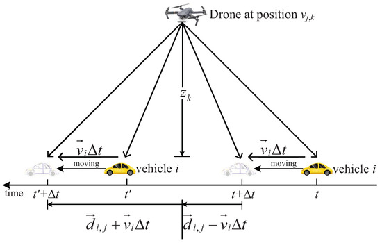 Similarly, in the case where a vehicle is associated with a drone, as shown in Figure 4, the horizontal distance between vehicle i and the drone at the location is defined as