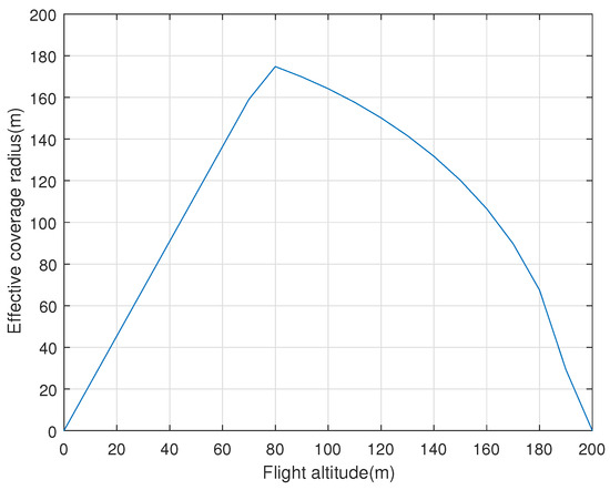 Take Figure 5 as an example to explain the influence of the flying height on , where , , , and are set to 4.88, 0.43, and 89 dB and 0.5, respectively. The relationship between height and effective coverage radius is not linear.