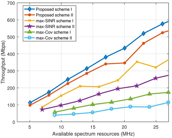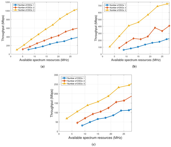 Additionally, dynamic DSC deployment outperforms static deployment. Specifically, the proposed scheme’s minimum spectrum resource requirement is 5 MHz, while at least 7 and 8 MHz are needed by the max-SINR and max-Cov schemes, respectively. Owing to efficient spectrum reuse and slicing, the proposed scheme’s network throughput is on average over 30% higher than the max-SINR scheme and over 45% higher on average than the max-Cov scheme.