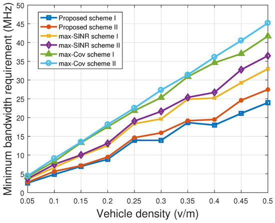 In the following simulation, the amount of available spectrum resources is 20 MHz. Figure 8 shows the impact of average vehicle density on the minimum spectrum resource consumption for different methods. Increasing vehicle density leads to greater demand for spectrum resources. The proposed scheme’s minimum spectrum consumption is on average over 15% lower than the max-SINR scheme and over 25% lower on average than the max-Cov scheme, with a slower growth trend as vehicle density rises.