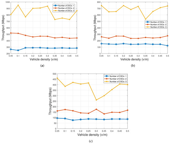 Impact of vehicle density and the number of DSCs on throughput: (a) proposed scheme I, (b) max-SNR scheme I, (c) max-Cov scheme I.