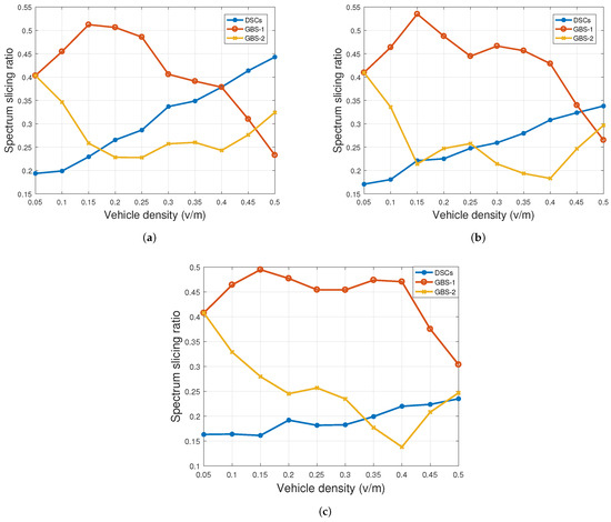 Impact of vehicle density on spectrum slicing ratios: (a) proposed scheme I, (b) max-SNR scheme I, (c) max-Cov scheme I.