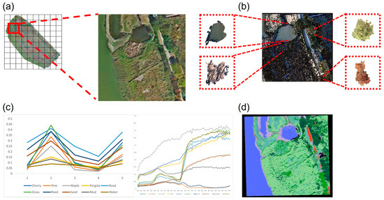 Wetland surveys play a vital role in comprehending and conserving complex ecosystems, thus contributing to the sustainable management of wetlands [5]. While traditional surveys rely heavily on human involvement, recent advances in remote sensing (RS) have facilitated surveys and data collection in a more cost-effective and efficient manner [6,7]. Remote-based surveys allow for non-invasive approaches and quantitative data acquisition [8,9]. Particularly, unmanned aerial vehicles (UAVs) have emerged as effective tools for acquiring various types of remote sensing data [10]. High-resolution imagery captured by UAVs encompasses a wide electromagnetic spectrum, including visible and infrared light [11]. Spectral-based data acquisition has been employed in research focused on classification and detection due to its ability to acquire biochemical and biophysical parameters [12]. Integrating spectral data with RS-based studies enables the mapping of large-scale target sites [13]. Mapping research utilizing high-resolution spectral data, such as multispectral and hyperspectral data, proves valuable in monitoring wetlands composed of diverse surface textures [14]. Furthermore, the use of UAV imagery has expanded to various fields, including ecosystem monitoring, environmental assessment, land use analysis, and mapping [15,16].