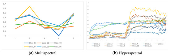 The multispectral and hyperspectral data obtained using UAVs have been used in many studies, but data analysis using training data construction shows the need for improvement. When constructing land cover maps using multispectral and hyperspectral light, it is difficult to simultaneously mount two UAV sensors into one body, which shows that there is a limit to the supply and demand of drone power and available weight. Therefore, time resolution problems can occur when acquiring images, and dissimilarities are identified between multispectral images and hyperspectral images, even though they are taken on the same day [73]. In this paper, hyperspectral images were photographed from 12:30 to 14:00, and multispectral images were photographed from 15:30 to 16:30. Both successfully completed on the same day, but a time error was confirmed when acquiring data using Rededge-MX. As a result, the difference in the left water system part of the multispectral image was confirmed, and it is judged to be due to the amount of light and angular height of the sun. Due to the aforementioned problems, the multispectral classification was organized into stones and mud, and in this study, it was substantiated that the road grade was composed of concrete and the rock type was similar to the road. When verifying data through image classification, it was confirmed that five of the verification target sites corresponding to No. 1 to No. 5 were less accurate. Each area is a verification destination with complex components as compared to other destinations, such as roads, autumn leaves, cherries, and grass, which indicates that categorization using hyperspectral light is more accurate than using multispectral light with fewer classes. In particular, the accuracy of the road was high, and in the case of autumn leaves, it is validated that the accuracy is high where the characteristics due to red light are clear. However, an overall high precision was recognized, but complex components, especially tree classes where overlap is identified, are less accurate in grouping, which results in other division algorithms being acknowledged as having the same problem [74]. Furthermore, if the reflectance of light from the sun, such as on sand, is high, roads are pinpointed with a similar spectrum.