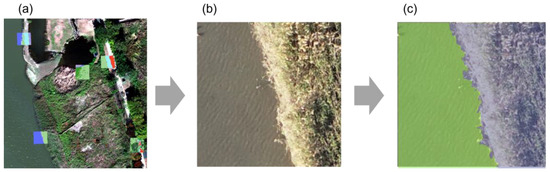 To construct accurate verification data for image validation, an on-site survey was conducted in five test beds on 17 and 24 October 2022. The verification data were generated based on the object segmentation image. High-resolution orthophotos and field verification were used to ensure the correct classification of each pixel-based class. A random 10 m2 grid was generated within each of the five squares to establish the verification data. The data were edited using ArcGIS Pro, and segment classification was performed using the orthophotos. The class was then edited using the corresponding image (Figure 4).
