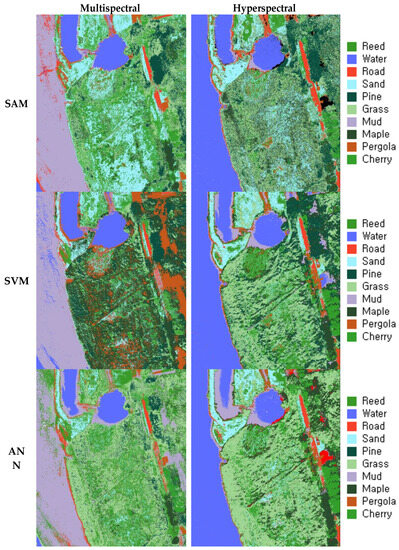 As a result of calculating the area according to each classification method, it was confirmed that the average grass (19.42%) and water (15.93%) areas of the hyperspectral and multispectral images were the largest, followed by maple (12.27%), mud (11.64%), reed (9.78%), pine (7.94%), cherry (7.37%), and roads (12%) (Table 5). Unclassification refers to groups that were not classified at the time of the categorization, and the in-image values have been identified as ANN (0.86%) and SVM (1.23%) during hyperspectral division. In the hyperspectral images, the largest class differences in ANN, SVM, and SAM were identified as reeds (±6.58%), maple (±6.48%), and sand (±6.14%), and ANN was characterized by differences in vegetation-related groupings such as pine (±13.96%) and grass (±7.48%). In the case of multispectral images, there were many variances in class proportions when classifying ANN, SVM, and SAM, and most notably, ANN had the largest difference in reeds (±22.62%), grass (±23.82%), maple (±21.31%), SVM sand (±20.26%), and cherry (±12.32%) compared to other classes.