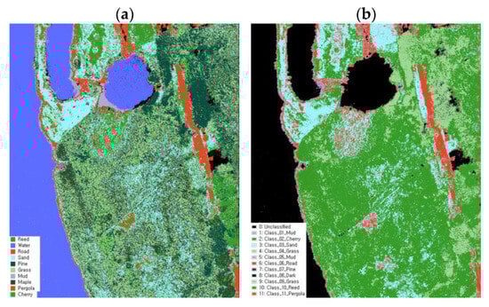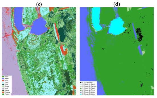 In this paper, we conducted a comparison of data sampling methods when classifying images. Although endmember extraction was used as an effective underlying data sampling technique in hyperspectral studies, it is difficult to obtain pure pixels of images from classifications within a similar spectrum, confirming that only some characteristic arrangements are possible. Similar data, such as for plants, suggest that there is a limit to detecting a complex target spectrum [75]. The endmember technique is considered particularly difficult to apply to multispectral images. This is evidenced by the fact that there are forty-eight maximum selection classes for hyperspectral light but only six for multispectral light, which varies from the absolute number. When comparing multispectral genres, problems are identified not only in the limitations of the six classes, but also in the degree of separation between the classes. Class 6 is highly associated with roads, whereas classes 2, 3, and 4 are determined to have a too low class separation from plants such as cherries, pine trees, reeds, and autumn leaves to pergolas and roads. This finding indicates that it is not effective for the correct class separation. Although we selected 11 classes with the same hyperspectral intensity and high association for spectral features, they were mainly distributed in classes 2, 3, 9, and 10, especially for statistical correlations above 0.9. The components corresponding to the area of many sheaths were mainly composed of grass, sand, reeds, and pine trees. Therefore, we discovered that sampling techniques using endmember extraction were not effective in classifying complex land coverings. The pixel sampling method was more effective for classification than the endmember technique, and pixel sampling had the advantage of reducing the phenomenon of “salt and pepper noise” [76]. Therefore, it is confirmed that pixel sampling techniques enable effective noise reduction and spectral library construction for class types. In this paper, when the land cover map was produced using the final member, the OA results were confirmed to be 53.41% for hyperspectral images and 41.61% for multispectral images.
