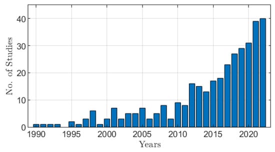 Keyword search terms employed in compiling the papers used to inform this review included: ‘stockpile volume estimation’, ‘stockpile measurement’, ‘photogrammetry’, ‘aerial survey’, ‘drone-based volume estimation’, ‘structure from motion (SfM)’, ‘digital surface model (DSM)’, ‘digital elevation model (DEM)’, ‘terrestrial laser scanning’, ‘indoor volume estimation’, ‘warehouse stockpile measurement’, ‘earthwork volume calculation’, and combinations of these terms. Furthermore, drone synonyms like ‘UAV’, ‘UAS’, and ‘aerial’, and stockpile synonyms like ‘earthwork’ and ‘landfill’, were considered. Relevant publications were assembled utilizing online databases, including Web of Science, Scopus, Google Scholar, ResearchGate, and journal publisher websites. Some interesting trends appeared during this search process. For example, Figure 1 shows the historical trend we found for the collected publications related to aerial stockpile volume estimation, based on our search criteria and keywords, while using Scopus. Clearly, the data reveal a significant surge in the application of drones for stockpile volume estimation starting from 2012.