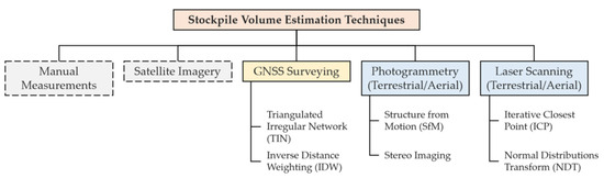 A wide range of techniques exists for estimating stockpile volumes, spanning from straightforward manual methods to more sophisticated approaches. A flowchart demonstrating a classification of these techniques, along with their typical respective sub-methods used for 3D reconstruction, is illustrated in Figure 2. In this section, we will briefly discuss these various techniques and their relevant applications.