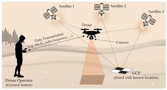 The exploration of innovative methods to enhance photogrammetry, such as the use of RTK drones, specialized geodetic class of drones, or a collaborative approach involving aerial-ground robots, has been gaining traction in the field. RTK drones, recognized for their superior positional accuracy in aerial mapping, outperform their consumer-grade counterparts by leveraging RTK technology [67]. This technology employs a fixed base station and advanced algorithms to correct GNSS signal errors in real time, as depicted in Figure 3. Despite their higher cost, the accuracy afforded by RTK drones was demonstrated by Jiang et al. [62] while evaluating earthwork volume changes, as they managed to reconstruct the 3D model with an average RMS (Root Mean Square) accuracy of 2–3 cm. When comparing the use of non-specialized low-cost drones with specialized geodetic class drones, Filkin et al. [38] intriguingly found no significant difference in results when using them for a waste disposal site volume estimation. On the other hand, collaborative approaches involving aerial-ground robots have shown promise in improving reconstruction accuracy, as highlighted by Liu et al. [63], whose system improved pile reconstruction accuracy by 61% compared to a single-agent setup, hence enhancing the volume-estimation error for a large landfill to an average error value of 0.27%.