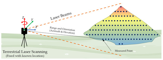 TLS, also known as Terrestrial LiDAR, is a popular method for acquiring 360° panoramic 3D coordinates of numerous points on land. It is achieved by emitting laser pulses towards these points and measuring the distance from the device to the target [15] (Figure 5). The process of aligning multiple TLS scans into a unified 3D model is known as scan registration [35,36,37]. It begins with identifying common features across different scans and using them for initial alignment. Algorithms, such as the Iterative Closest Point (ICP) and Normal Distributions Transform (NDT), are then employed to refine this alignment by minimizing the difference between corresponding points. Manual adjustments and error minimization techniques may be used to ensure alignment quality. Once accurately aligned, the scans are merged into a single cohesive 3D model. This complex process requires a combination of specialized software, automated algorithms, and manual interventions, and it plays a vital role in ensuring that the final 3D model faithfully represents the scanned environment.
