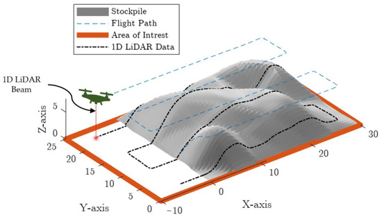 Starting with airborne-LiDAR systems, Amaglo [78] conducted aerial surveying with a drone (customized Matrice 600 Pro) equipped with a 3D LiDAR (Velodyne Ultra Puck) to scan and estimate the volume of a stockpile, comparing its results with that from TLS and drone photogrammetry. While TLS required three times the capturing time taken by both photogrammetry and LiDAR, LiDAR required only half the processing time of the other methods. In terms of the estimated volume, the difference between the volume estimated by TLS compared to that from LiDAR and photogrammetry was around 0.7% and 3%, respectively. Forte et al. [79] also employed a drone equipped with a LiDAR sensor but used online/real-time localization estimation by fusing on-board data (such as IMU and GPS) and the LiDAR data with known environmental factors to correct the estimated altitude of the drone. They applied this approach to estimate the volume of three large coal stockpiles, using a DJI Matrice 100 drone equipped with a 3D LiDAR (SICK LD-MRS420201). The volume estimation obtained without altitude correction resulted in a misaligned point cloud, which subsequently led to a volumetric error exceeding 10% when compared to the point cloud fully aligned via the proposed method. Alsayed et al. [1] conducted a study in a UK cement plant, where they employed a drone equipped with GPS for localization, a 1D LiDAR for mapping, and a barometer for altitude. The system was assessed by mapping a coal pile of unknown volume in an open area and a pile with a known volume in a semi-confined space. Visual inspection of the generated stockpile surface revealed a strong correlation with the actual pile in the open area, and the volume of the pile in the semi-confined area was measured with a volumetric error of around 2.4%. This study was the first to demonstrate the effective use of a single-point range sensor (1D LiDAR) pointed towards the ground for scanning stockpiles, presenting a cost-effective and efficient way of stockpile mapping and is illustrated in Figure 7.