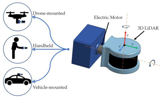 The use of LiDAR-based scanning techniques has found application in various fields. In agriculture, for instance, Zhang and Grift [73] used a LiDAR approach to measure crop height, while Siebers et al. [74] utilized a 3D LiDAR on a rover to monitor plant growth. In soil surface measurement, Foldager et al. [75] used a rail-mounted 3D LiDAR to achieve a narrow measurement of 40 mm and monitor changes over time. For mining and earthwork, Carabassa et al. [76] monitored soil erosion using a drone equipped with a LiDAR sensor, and Liu et al. [77] applied an aerial-borne LiDAR approach to monitor mining. In the context of stockpile monitoring and estimation, LiDAR sensors can be applied in various ways, such as being attached to a drone, rail-mounted, tripod-mounted, or handheld by an operator (Figure 6). Table 2 summarizes LiDAR-based approaches for outdoor stockpile volume estimation. The table compares these studies considering aspects such as application, platform, scanning payload, and estimated volumetric error.