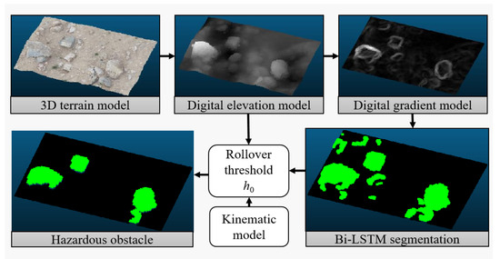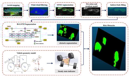 In summary, the existing unstructured scenarios predominantly delineate three principal classifications. These classifications encompass natural landscapes inclusive of mountainous terrain and grassland expanses, urban thoroughfares encompassing thoroughfares, architectural constructs, and pedestrian domains, and interior environments characterized by unstructured layouts, furnishings, and ornamental embellishments. Most existing work focuses on semantic segmentation of the terrain environment without considering vehicle dynamics, classifying obstacles of interest as pits, bulges, stones, etc. [26,27]. Additionally, most of the ways to process data require extremely high computational power and deep network structures. This paper proposes a hazardous obstacle detection framework tailored for unmanned engineering vehicles engaged in operations within natural landscapes. The key novelty of this work is the combination of point cloud segmentation techniques with vehicle geometry models. The pre-processing and Bi-LSTM networks employed achieve competitive results without excessive computational power. Furthermore, it provides more effective driving safety semantic information for high-precision maps of unstructured scenes. The main contributions of this paper can be summarized as follows: