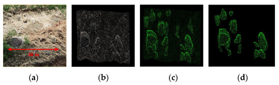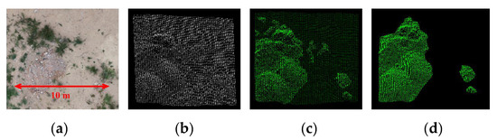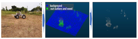 Throughout the image acquisition procedure, the terrain-derived point cloud sourced from the drone’s tilting maneuver often exhibits instances of noise, outliers, and perturbations stemming from carrier frame oscillations, as well as effects introduced by factors like smoke, dust shading, and variations in illumination. Moreover, as illustrated in Figure 3, the presence of weeds within the unstructured environment might not directly compromise the operational security of unmanned engineering vehicles. Nevertheless, these elements can be erroneously interpreted as obstacles within the point cloud data, thereby impinging upon the decision-making process. To faithfully represent the underlying topographical contours, the original point cloud undergoes a preliminary pre-processing stage rooted in statistical filtering, encompassing both geometric and color space domains. This procedural facet encompasses the exclusion of outliers and weed-associated point clouds.
