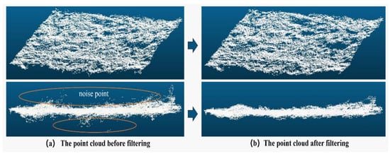 Assuming that the average geometric distance between any point in the point cloud and the surrounding points follows a normal distribution , a filtering threshold of is adopted in this paper. Points with an average distance greater than the threshold are considered outliers and filtered out.