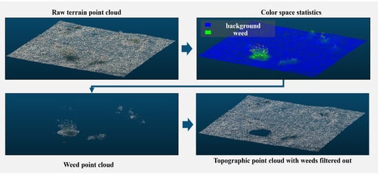 Given the inclusion of comprehensive color characteristics within point cloud models derived from unmanned aerial photography and the notable dissimilarity in feature information between weeds and other entities within unstructured terrains, this study presents a method for weed surface filtration utilizing color space statistical filtering.