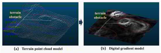 The digital gradient model is constructed by applying the Sobel-G operator to the digital elevation model. The gradient values in the digital gradient model are then converted to grayscale for visualization and further processing. Figure 7 shows the terrain obstacles’ contours clearly observed in the digital gradient model.