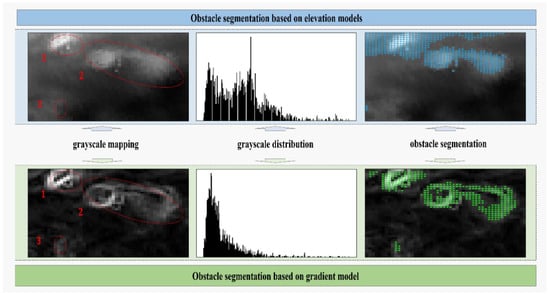 Subsequent to the derivation of the digital gradient model through the utilization of the Sobel-G operator, a subsequent phase entails the partitioning of terrain impediments along their boundaries. Within the scope of this research, the OTSU segmentation algorithm is deployed to effectuate the partitioning of concave-convex barriers based on the gradient model. As illustrated in Figure 8, the segmentation outcomes reveal the accurate identification of three obstacles within the non-structured terrain through the employment of gradient model-based segmentation. In contrast, only two larger obstacles are discernible from the elevation model. Furthermore, the boundaries demarcating the segmented obstacles are characterized by enhanced precision when employing the gradient model-based segmentation approach.
