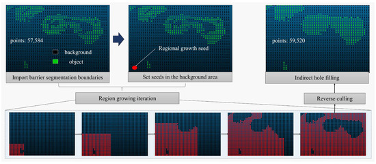 The hole-filling point cloud growing algorithm runs inward from the hole boundary in a single iteration. Through multiple iterations, the point cloud holes can be filled, as depicted in Figure 6.