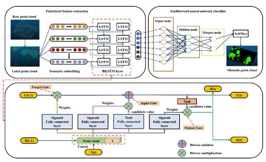 After completing the aforementioned steps, the semantic information of the geometric features of the target obstacle’s point cloud in the unstructured environment is fully extracted. To efficiently extract obstacles of the same type from the point cloud, we manually labeled the extracted obstacle information and employed a bidirectional long short-term memory (Bi-LSTM) deep learning method based on a bidirectional recurrent neural network to analyze the target features. The structure of the network is illustrated in Figure 10. The key components include a sequence input layer, a bidirectional long- and short-term memory layer with 300 hidden units, a fully connected layer, a classification layer, and a softmax layer.