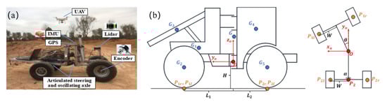 in the above equations, represents half the track width. and represent the distances from the front and rear axles to the center of gravity, respectively; H denotes the height of the steering hinge point; represents the articulated steering angle; and represents the rear axle swing angle.