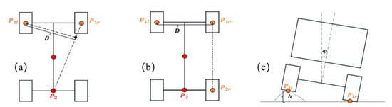 In order to determine the grounding points of the tires, their coordinates must be determined. These include the left front wheel P1l(x1l, y1l, z1l), right front wheel P1r(x1r, y1r, z1r), left rear wheel P2l(x2l, y2l, z2l), and right rear wheel P2r(x2r, y2r, z2r), expressed as: