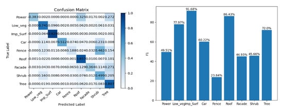 Confusion matrix and F1 score of our method on the ISPRS benchmark testing data.