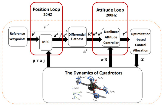 - Sun, S.; Romero, A.; Foehn, P.; Kaufmann, E.; Scaramuzza, D. A comparative study of nonlinear mpc and differential-flatness-based control for quadrotor agile flight. IEEE Trans. Robot. 2022, 38, 3357–3373. [Google Scholar] [CrossRef]