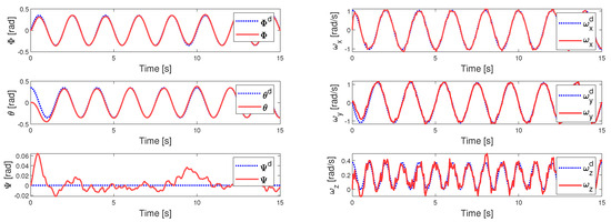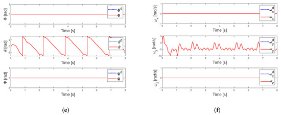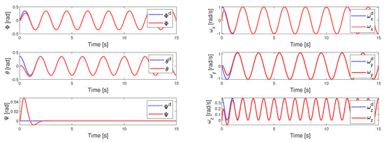 Firstly, the simulation was carried out without the external disturbances. In Figure 3, the actual and desired attitude and angular rate in three axes are plotted over time. As can be observed in the graph, even with an initial deviation between the actual and desired pitch angle, the system stabilized within 2 s. Subsequently, the system accurately tracked the specified attitude angles and angular velocities throughout the ensuing timeframe.