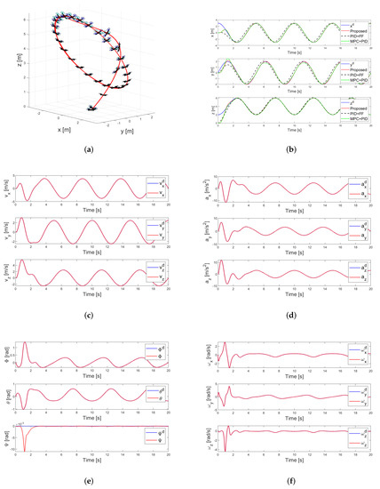 The waypoints and the actual flight path by the three controllers are illustrated in Figure 6. The comparisons between desired and actual values of position, velocity, acceleration, attitude, and angular rate are plotted in separate subplots of Figure 6.