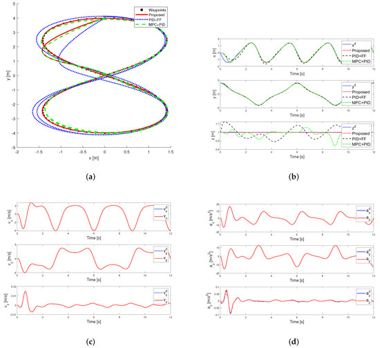 To examine the performance of the proposed controller in waypoint tracking, a simulation was conducted utilizing the Bernoulli lemniscate as the reference trajectory. Similarly, the above two controllers (the PID controller with velocity and acceleration feedforward and the controller that combines MPC for position control with PID for attitude control) were implemented for comparison. The given reference waypoints are as follows. The initial position of the quadrotor-UAV was set at , and both velocity and acceleration were set to zero at the initial time.