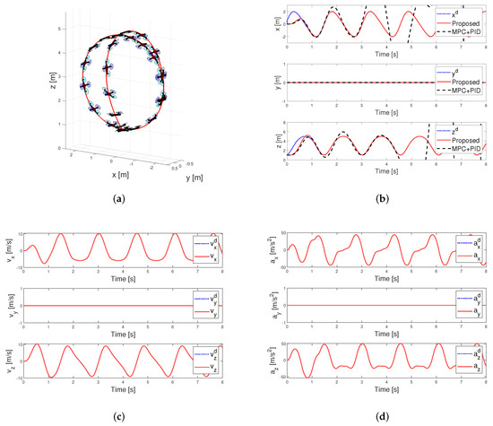 where R was set to 2 m, and was set to 6 m/s. The initial position for the quadrotor-UAV was established as , and both velocity and acceleration were set to zero at the initial time. In order to track the given waypoints accurately, the pitch angle of the quadrotor-UAV was required to complete a full attitude maneuver from 0 to . Additionally, the large steps in the velocity and acceleration terms at the initial time made it more challenging for the controller.