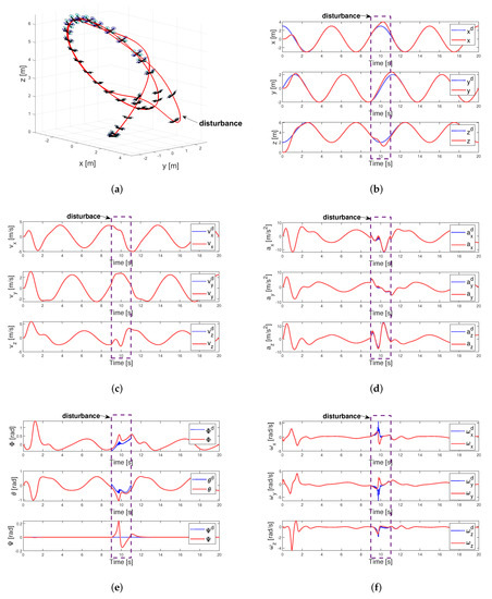 The reference waypoints in this case are defined by Equation (45). The initial position for the quadrotor-UAV was set at , with both velocity and acceleration initialized to zero at the initial time. Moreover, a significant external disturbance was introduced during the 9th to 11th seconds as shown in Figure 9. During this time interval, a constant force was exerted on the quadrotor-UAV to simulate external disturbances, with magnitudes of 2.5N, 2N, and 1.5N along the three axes, respectively. Given the desired trajectory, observation errors, and external disturbances, the tracking performance of the controller is evaluated by comparing the desired position, velocity, acceleration, attitude, and angular velocity to the actual values in Figure 9.
