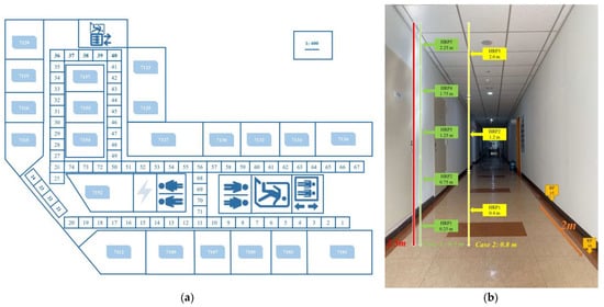 Data collection and testing were performed on the seventh floor of the new engineering building at Dongguk University, Seoul, Korea. As shown in Figure 3a, the target area was split into 74 grids of 2 m × 2 m RPs in an area sized 52 m × 32 m. In addition, considering the dimensions of the UAV devices and the requirements of certain usage scenarios, five grids containing 0.5 m HRPs (Case 1) and three grids containing 0.8 m HRPs (Case 2) were set, with the roof height being 2.5 m, as shown in Figure 3b. Because each RP represented the grid centre, any location in the grid could be assumed to be an RP. As shown in Figure 3b, the distance between any two adjacent RPs was 2 m. The positioning server was a Dell Alienware Model P31E, and a smartphone (Samsung SHV-E310K) was used instead of a UAV for data collection and testing. Python was used to build the fingerprint database, classify the fingerprints, and run the online experiments.