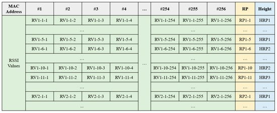 The RSSI data were converted to a comma-separated value (CSV) file and sent to the deep-learning model. Figure 4 shows the produced CSV file structure, containing all of the collected RSSI data, including 256 MAC addresses from various APs (grey box) and RSSI values (green box) for each RP (yellow box) and HRP (blue box). The RSSI values were measured five times at each RP and HRP, in the forward and backward directions. The sample duration for each RSSI measurement was 5 s, and the total sampling time was 25 s for the five measurements.