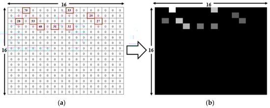 The input image was generated using the RSSI data from 74 RPs and 5 or 3 HRPs. Each RP and HRP recorded the RSSI for 256 APs, although only some of these APs are displayed in this paper. The RSSI data from several APs generated a 16 × 16 picture. Figure 6a shows nine visible RSSI values, ranging from 25 to 70, among 256 APs, with the remaining values represented as 0. Figure 6b illustrates the RSSI values as a grayscale image, with higher RSSI values associated with brighter pixels. The brightest grayscale image corresponds to the maximum RSSI of 70, while the darkest non-black image corresponds to the minimum RSSI of 25. The remaining 247 locations appear dark, as their RSSI values are zero. Similarly, the input RSSI files for other RPs and HRPs produce distinct images for the deep-learning network.