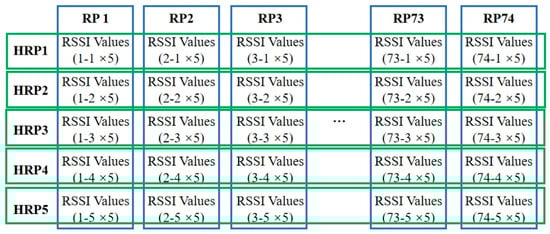 Example of Case 1 RSSI dataset conversion for RP and HRP; (2-1 ×5) indicates five RSSI data measurements at the height of HRP1 at RP2.