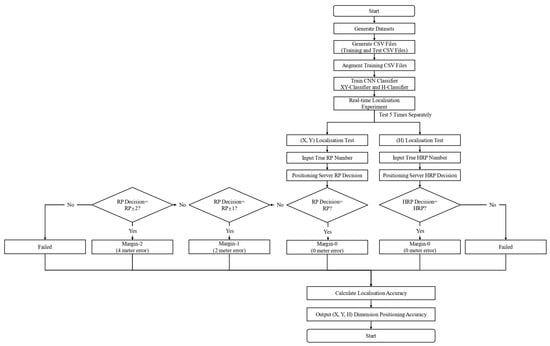 The Python-based CNN classifier generated a metafile with a set of weights and biases after each epoch. Many metafiles were generated after multiple epochs, and the metafile with the highest success rate was selected for subsequent real-time localisation experiments (online phase). The trained classifiers were used in real-time experiments (offline phase), and position tests were conducted using a measurement machine and a location server. RSSI values were collected at each known RP and HRP during the actual measurements, and the collected values were fed into the trained classifier for comparative analysis to determine the and dimensions of the unknown user. Five RSSI measurements were obtained at the same RP and random HRP for each experiment, and the trained classifier fed back the five localisation decisions from the location server, i.e., and . No additional hardware was used for the 3D indoor positioning. Figure 8 shows the process flow of the proposed method, offering a more intuitive visualisation of the algorithm’s structure and execution paths compared with the pseudocode.
