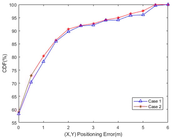 The effectiveness of the dimension was defined as the cumulative distribution function (CDF) of the location error within a specified distance, as shown in Figure 9. An accuracy of more than 90% was achieved with a location error of approximately 2.07 m (Case 1) and 1.92 m (Case 2), and an accuracy of more than 80% was achieved with a location error of 1.11 m (Case 1) and 0.98 m (Case 2). In the case of the dimension, the height of the testing floor was only 2.5 m, considerably smaller than the dimensions (52 m × 32 m). Therefore, for the dimension, a 2 m × 2 m RP grid was likely excessively small, and the Margin-2 case (4 m error) was considered to be the maximum positioning error. In contrast, for the (H) dimension, a localisation grid with a height of 0.5 m (Case 1) or 0.8 m (Case 2) represented a large positioning range in comparison with the 2.5 m floor height. For example, in Case 2, when the test device was at HRP2 (height of 1.2 m), Margin-1 already included all heights, which could not truly reflect the effectiveness of localisation. Therefore, the maximum positioning error for the dimension was set as 0 m (Margin-0). Consequently, the maximum positioning errors in the dimension (Margin-2) and dimension (Margin-0) were similar.