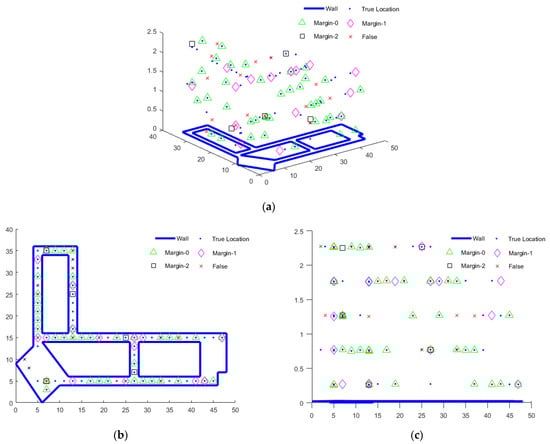 Figure 10 shows the positioning performance in the dimension. The blue line represents the walls in the experimental environment, and the blue dots represent the true positions and user locations. The test results for Margin-0 are marked in green, appearing consistent with the blue dots. The test results for Margin-1 and Margin-2 are marked in pink and black, respectively: The height is consistent with the blue dots, but with errors of 2 m and 4 m in the dimension. Failed positioning points are marked in red, indicating errors in the HRP or errors exceeding 4 m in the dimension. In particular, Figure 10 shows the results of a single positioning trial for Case 1. The successful positioning counts for Margin-0, -1, and -2 were 38, 16, and 5, respectively, with positioning success rates of 51.4%, 73.0%, and 79.7%, as indicated in Table 9.