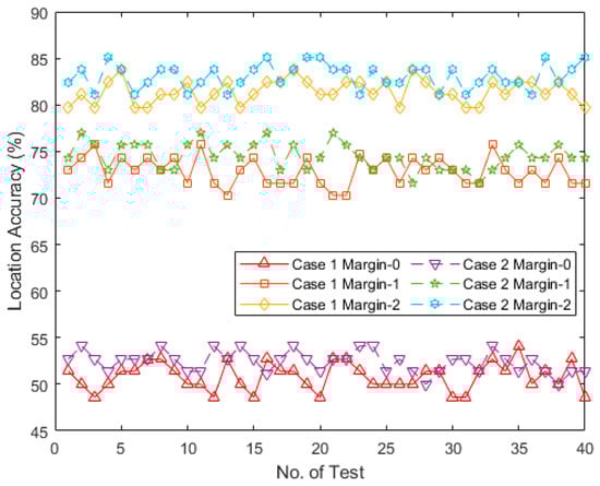 Table 10 presents the positioning accuracy in two dimensions: and . The indoor positioning accuracy for was significantly lower than that for the (X,Y) case. For example, in Case 1, the positioning accuracy for Margin-0 in the dimension was approximately 6% lower, indicating the occurrence of four fewer successful tests for Margin-0 compared with those in the previous scenario. The accuracies for Margin-1 and Margin-2 decreased by approximately 14% and 9%, respectively. A similar pattern was observed in Case 2, with the Margin-0, Margin-1, and Margin-2 values decreasing by approximately 5%, 13%, and 8%, respectively. Overall, the reduction in Case 2 was smaller than that in Case 1, indicating that the positioning of was more robust when a larger positioning interval was used.
