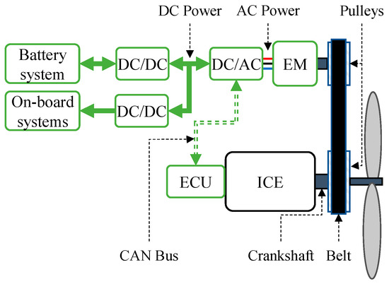 - A three-phase brushless DC Electric Machine (EM), used as ICE starter and generator for conventional operation [20];