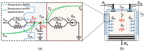 The CHT dynamics are described by employing an electrical analogy as shown in Figure 3a, where the heat transferred through the ICE cylinder wall is in-part stored in the cylinder walls () and in-part dissipated through convection and radiation towards the environment (). Assuming a thin and highly conductive cylinder wall, the heat balance can be written as follows [22,23,24,25]: