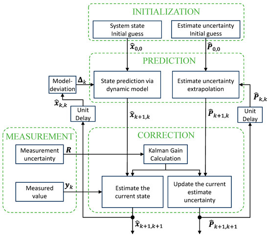 In a discrete-time formulation, the state vector estimation at step () and the measurements vector at step () are as follows:
