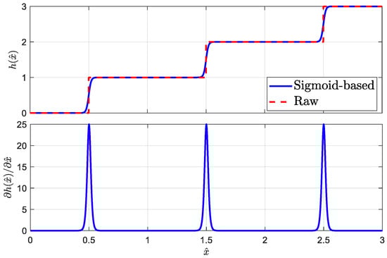 Given the low-resolution quantization (1 °C) of the CHT sensor, modelled by a round function, and the EKF’s requirement for a differentiable sensor model, a sigmoid-based function is employed to approximate the nonlinear round function. The sigmoid ensures a smooth approximation with a finite derivative, satisfying the EKF’s requirements. The resulting sigmoid-based measurement model is presented in Equations (27) and (28):