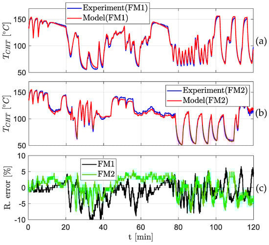 Figure 6 compares the simulated and experimental time histories values of the CHT: in particular, Figure 6a reports the results related to the dataset used for the parameters identification (FM1), while Figure 6b shows the validation results (FM2). Figure 6c points out that the mean and peak errors are lower than 2% and 10%.