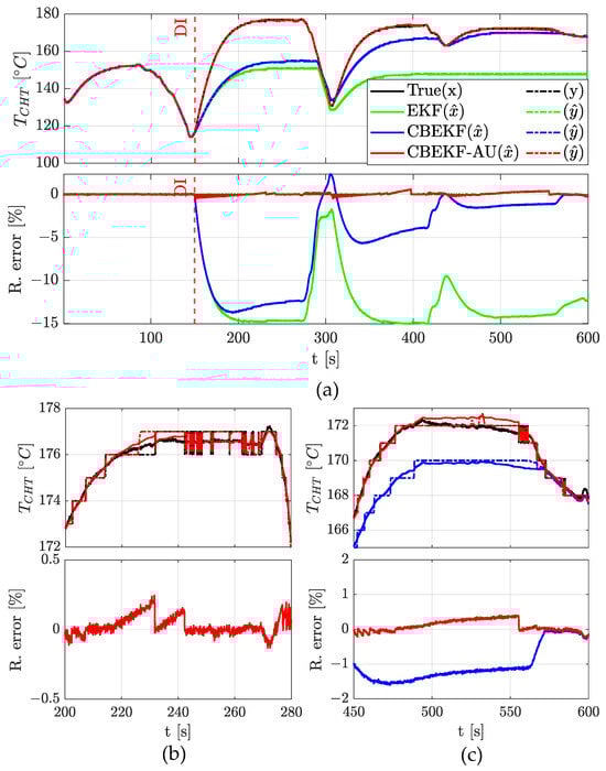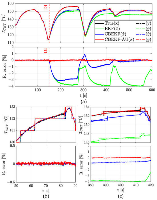 To further evaluate the capability of the CBEKF-AU in estimating CHT in degraded conditions, another test, similar to the previous one, was carried out, with a high degradation factor (), causing the temperature to significantly increase (+20 °C) with respect to nominal conditions. The results, shown in Figure 8, highlight that the relative error increases, though remaining lower than 1%, which is lower than the quantization step.